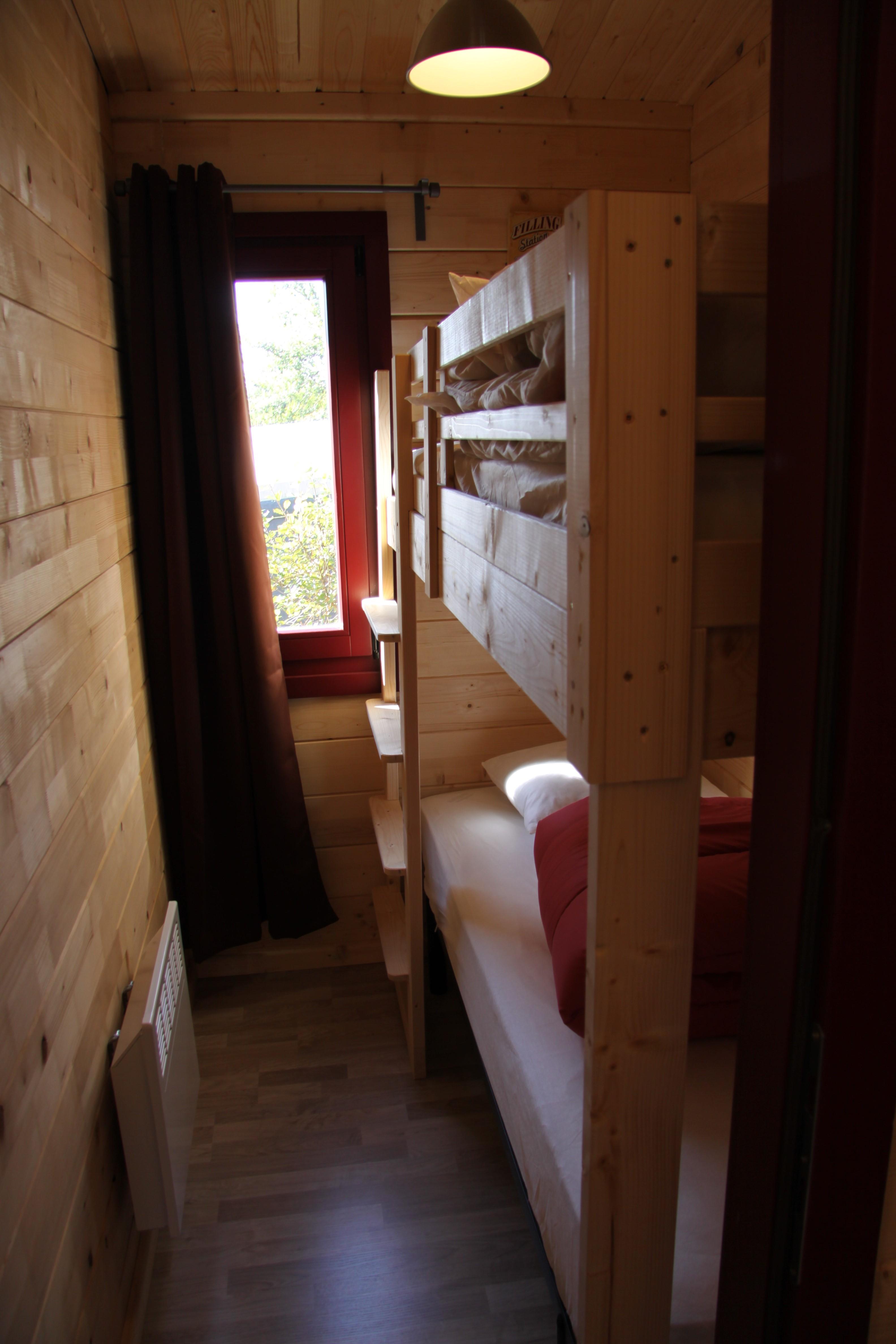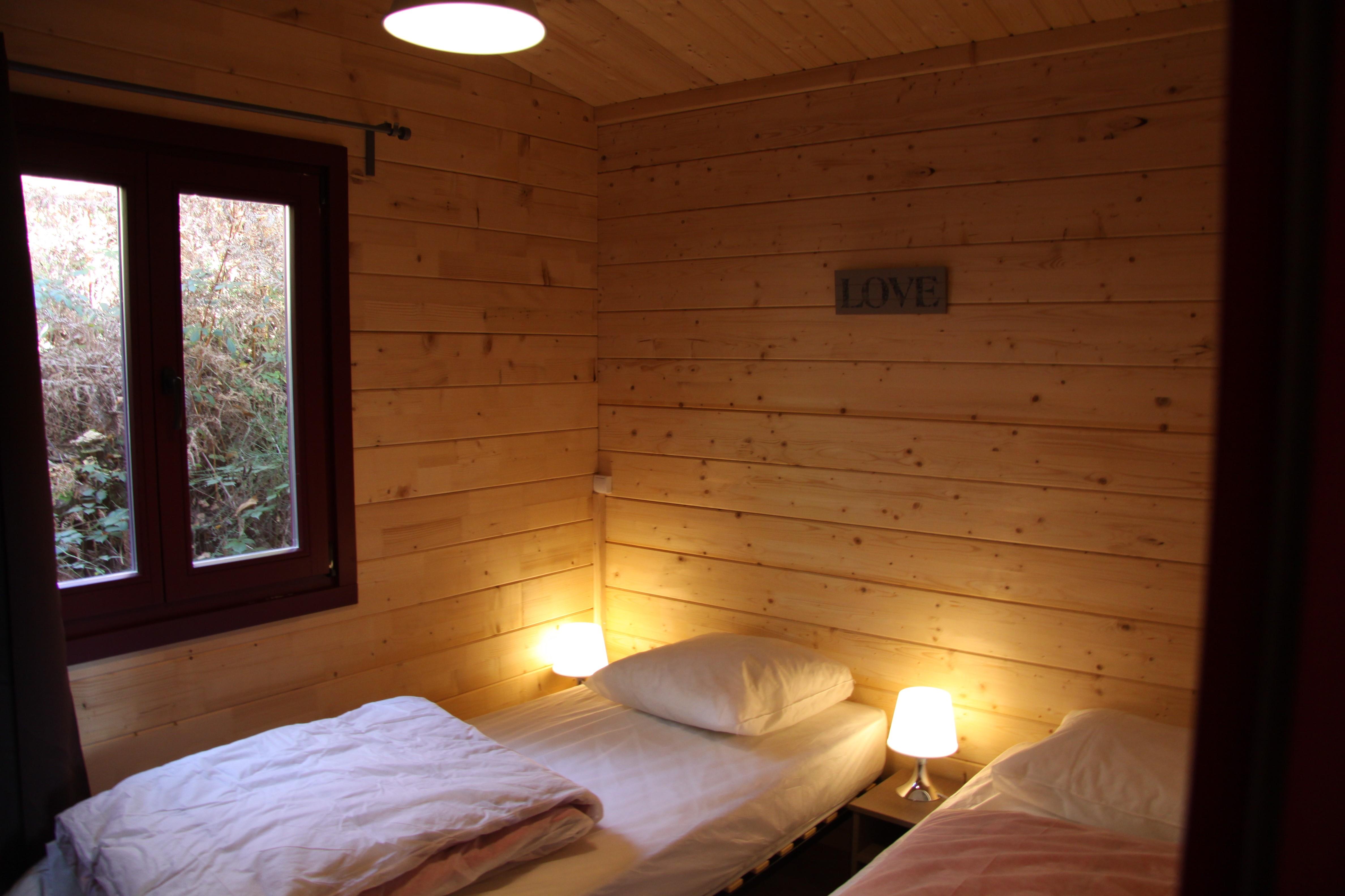 Ils sont équipés d’une cuisine aménagée (incluant table de cuisson, réfrigérateur, évier et vaisselle), un salon, une salle d’eau avec douche et WC séparés. Les portes vitrées s’ouvrent sur une grande terrasse dont une partie est au soleil. L’espace nuit est composé de 3 chambres. Deux chambres très modulables avec chacune un lit Queen Size (160 cm x 200 cm) composé de 2 lits (80 cm x 200 cm). Les chalets disposent aussi d’une chambre avec 2 lits superposés (80 cm x 190 cm).